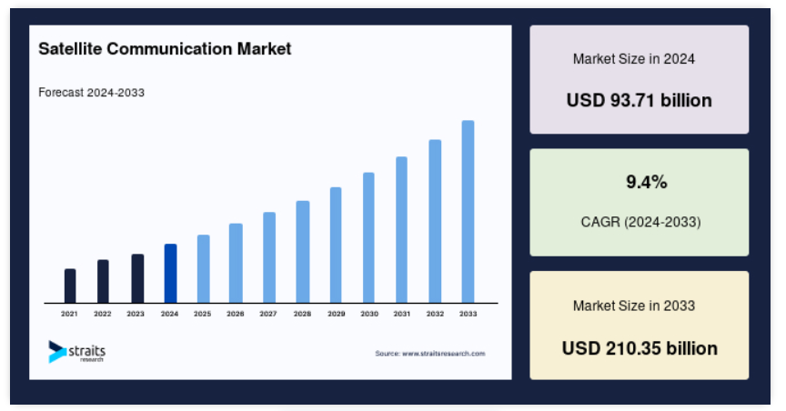 世界の衛星通信市場規模は2024年に937億1000万米ドルと評価され、2025年に1025億2000万米ドルから2033年には2103億5000万米ドルに達し、予測期間(2025年~2033年)には9.4%のCAGRで成長すると予想されています。