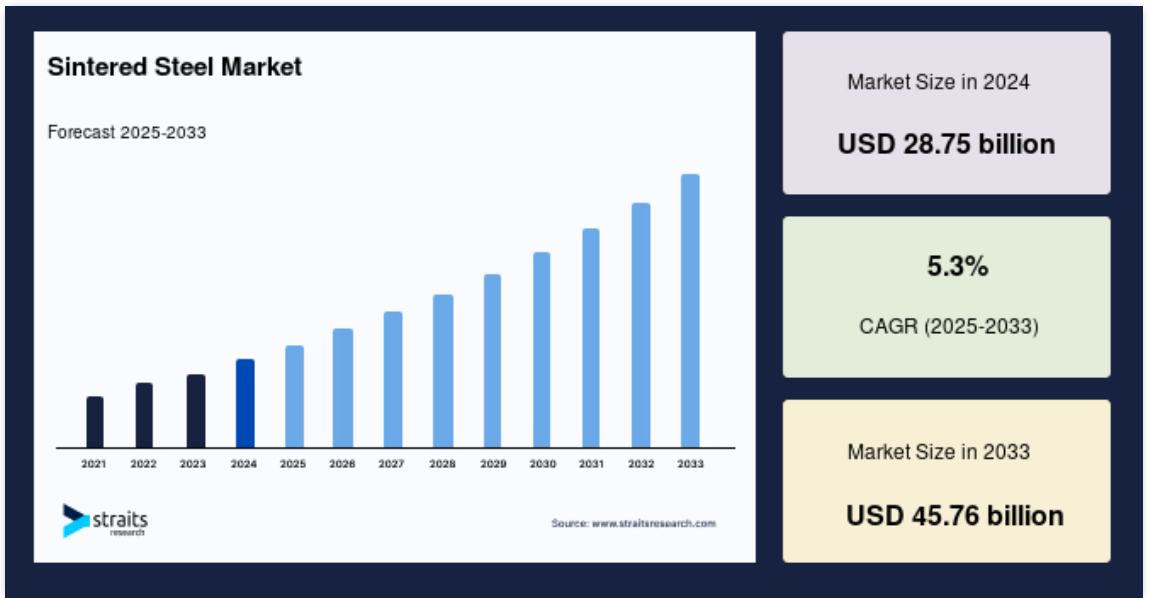 世界の焼結スチール市場規模は2024年に287.5億米ドルと評価され、2025年には302.7億米ドル、2033年には457.6億米ドルに達すると予測され、予測期間中(2025-2033年)の年平均成長率は5.3%を記録します。無駄が少なく、精度の高い金属部品を安価に生産することが重視されるようになり、特に自動車産業において焼結スチール市場の成長を促進することが期待されています。