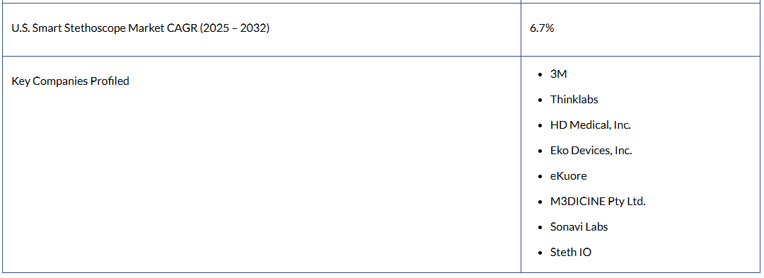スマート聴診器市場の主要企業には、3M、Thinklabs、HD Medical, Inc.、Eko Devices, Inc.、eKuore、M3DICINE Pty Ltd.、Sonavi Labs、Steth IOなどが挙げられます。