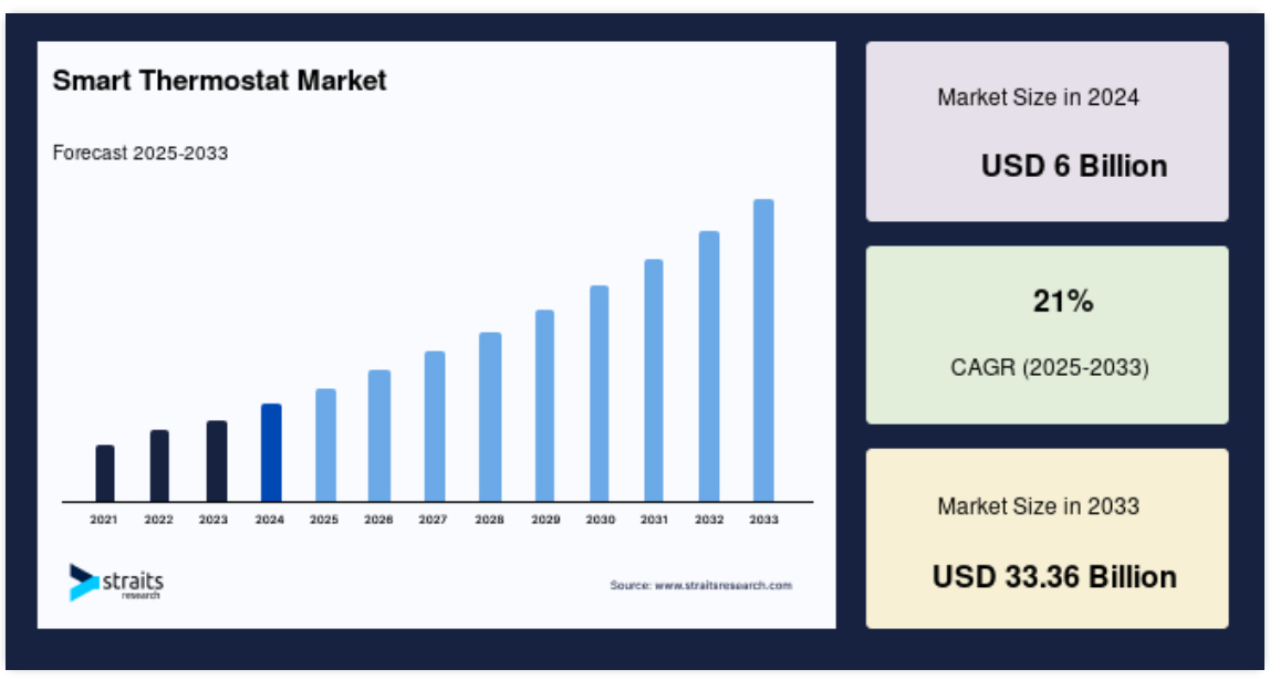 スマートサーモスタットの世界市場規模は、2024年に60億米ドルと評価され、予測期間中(2025-2033年)の年平均成長率は 21%で 、 2025年の72.6億米ドルから 2033年には 333.6 億米ドルに達すると予測されています。