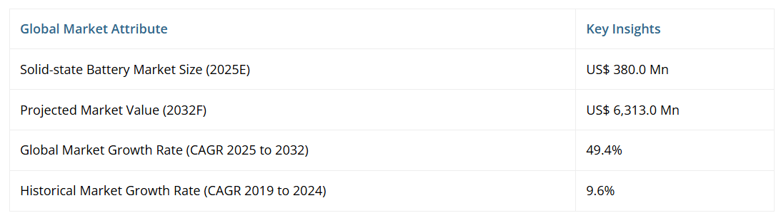 パーシステンス・マーケット・リサーチの調査によると、世界の固体電池市場規模は、2025年の3億8,000ドルから、2032年までに年平均成長率(CAGR)49.4%という堅調な伸びを示し、約63億1,300ドルに達すると予測されています。