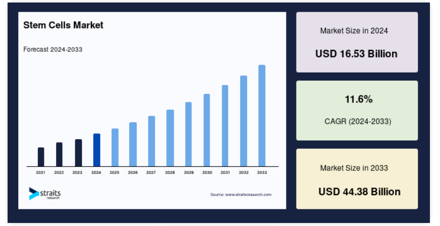 世界の幹細胞市場規模は2024年に165億3000万米ドルと評価され、2025年の184億4000万米ドルから2033年には443億8000万米ドルへと成長し、予測期間(2025年~2033年)には年平均成長率44.38%で成長すると予想されています。
