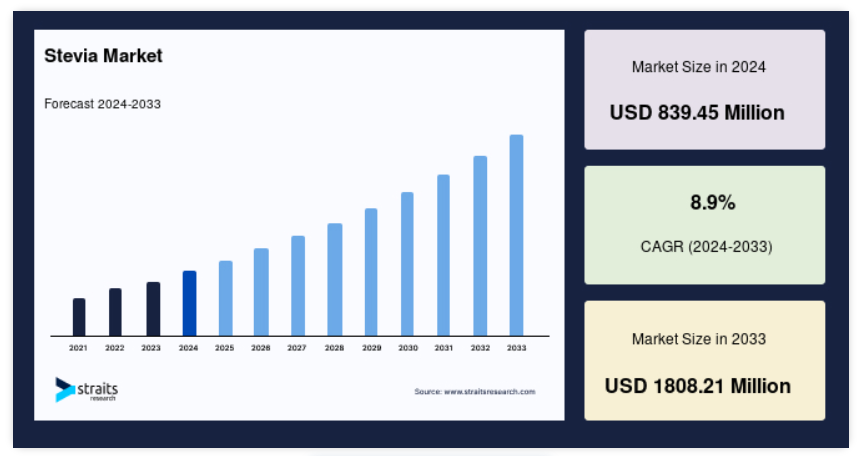 ステビアの世界市場規模は 2024年に8億3,945万米ドルで、予測期間(2025-2033年)の年平均成長率は8.9%を記録し、2025年には9億1,417万米ドルから2033年には1億8,821万米ドルに達すると予測されています。