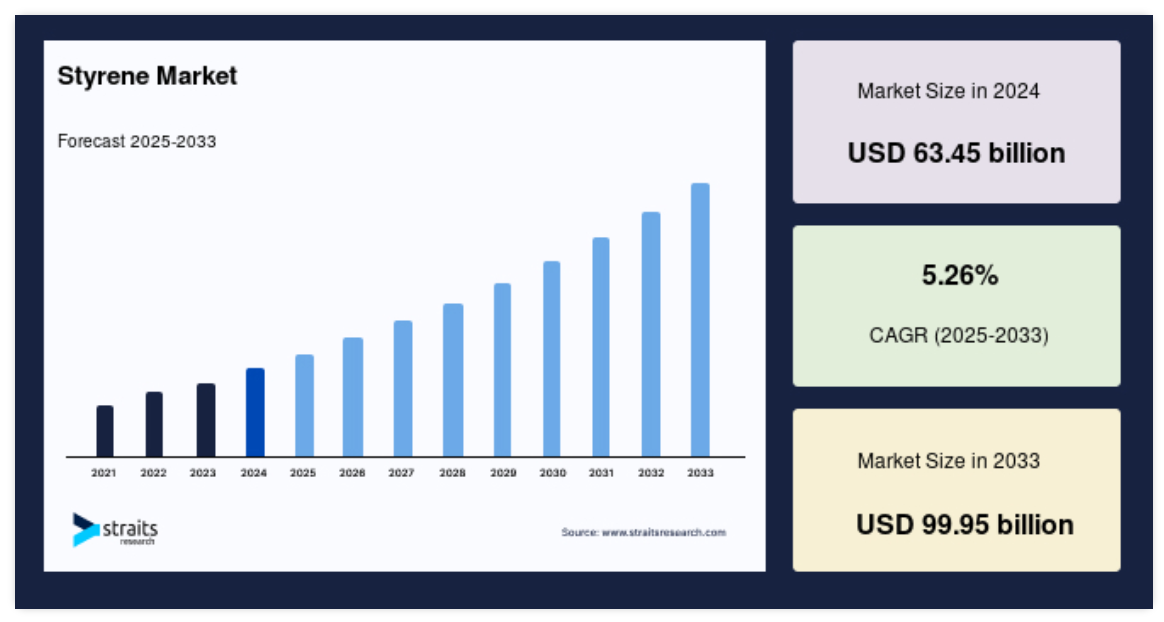 アナリストの見解によると、世界のスチレン市場は、自動車、建築、電子機器、包装など様々な産業での広範な使用により、着実な成長を遂げています。ポリスチレンの主要成分であるスチレンは、断熱材、包装材、消費財などの製品製造に不可欠です。スチレンベースの製品が提供する軽量で費用対効果の高い材料への需要が市場に影響を与えています。