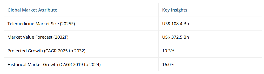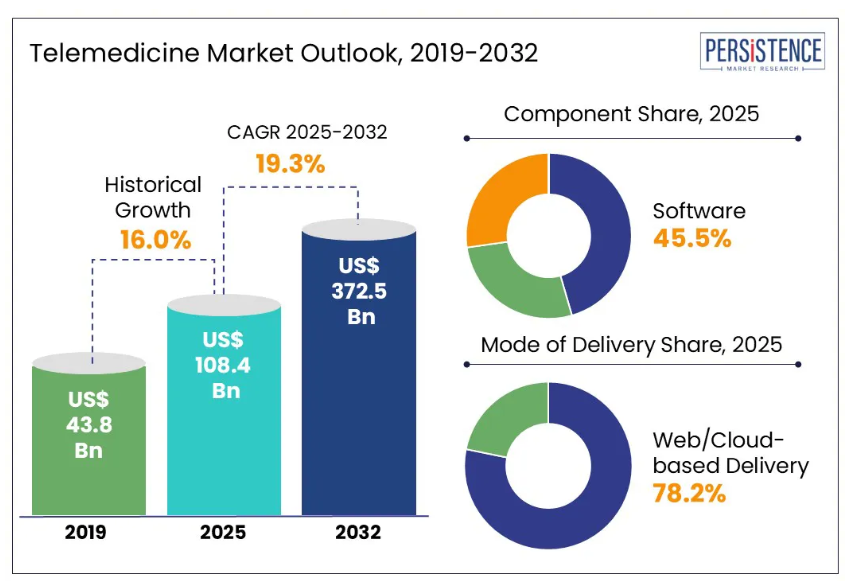 パーシステンス・マーケット・リサーチ社の報告書によりますと、世界の遠隔医療市場の規模は、2025年の1084億ドルから2032年までに3725億ドルへ成長すると予測されております。同市場は、2025年から2032年までの予測期間において、年平均成長率(CAGR)19.3%を記録すると見込まれております。