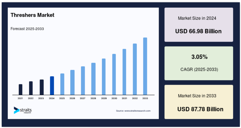 世界の脱穀機市場規模は、2024年には669.8億米ドルと評価され、2025年には690.3億米ドル、2033年には877.8億米ドルに達すると予測され、予測期間(2025-2033年)のCAGRは3.05%で成長する見込みです。