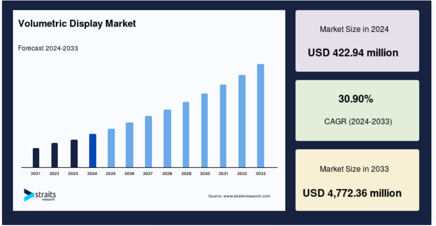 これらの開発は、体積型ディスプレイの視覚的品質を向上させるだけでなく、精度とリアルタイム・フィードバックが重要な産業での用途を拡大し、市場成長の機会を生み出しています。