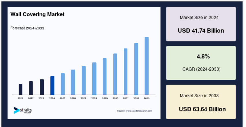 世界の壁装材市場規模は、2024年には417.4億米ドルと評価され、2025年には437.4億米ドル、2033年には636.4億米ドルに達すると予測されています。予測期間(2025年~2033年)中のCAGRは4.8%で成長すると予測されています。