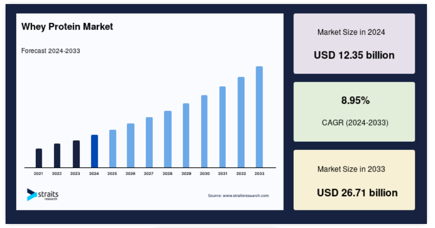 当社のアナリストによると、健康意識の高まり、フィットネスブーム、高品質の栄養補助食品の需要の増加により、世界のホエイプロテイン市場は大幅な成長が見込まれています。アナリストは、植物由来や乳糖を含まないホエイパウダーなど、製品配合の革新が主な成長要因になると考えています。