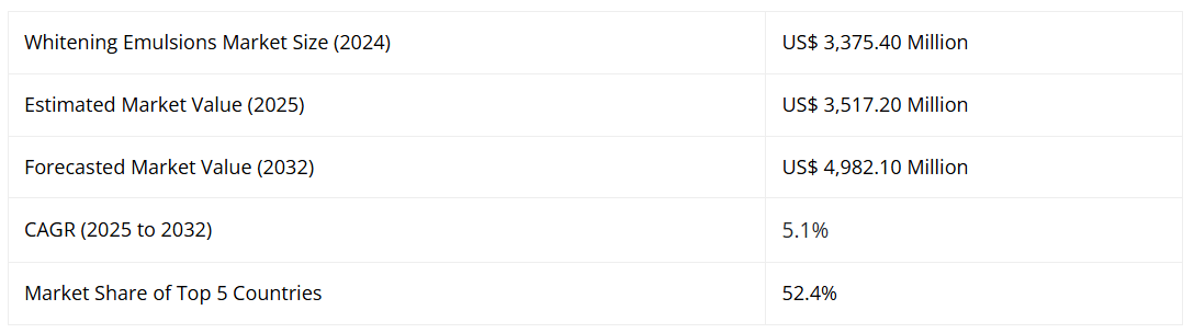 美白エマルジョンの世界市場は、予測期間(2025年から2032年)において、5.1%の価値ベースCAGRで成長すると見込まれています。