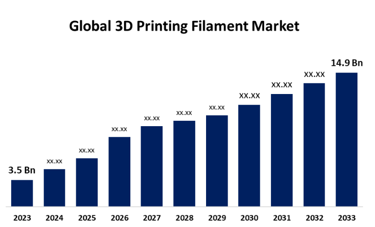 世界の3Dプリンティングフィラメント市場は、予測期間2023年から2033年の間に年平均成長率15.59%で成長し、2033年までに149億米ドルに達すると予測される。