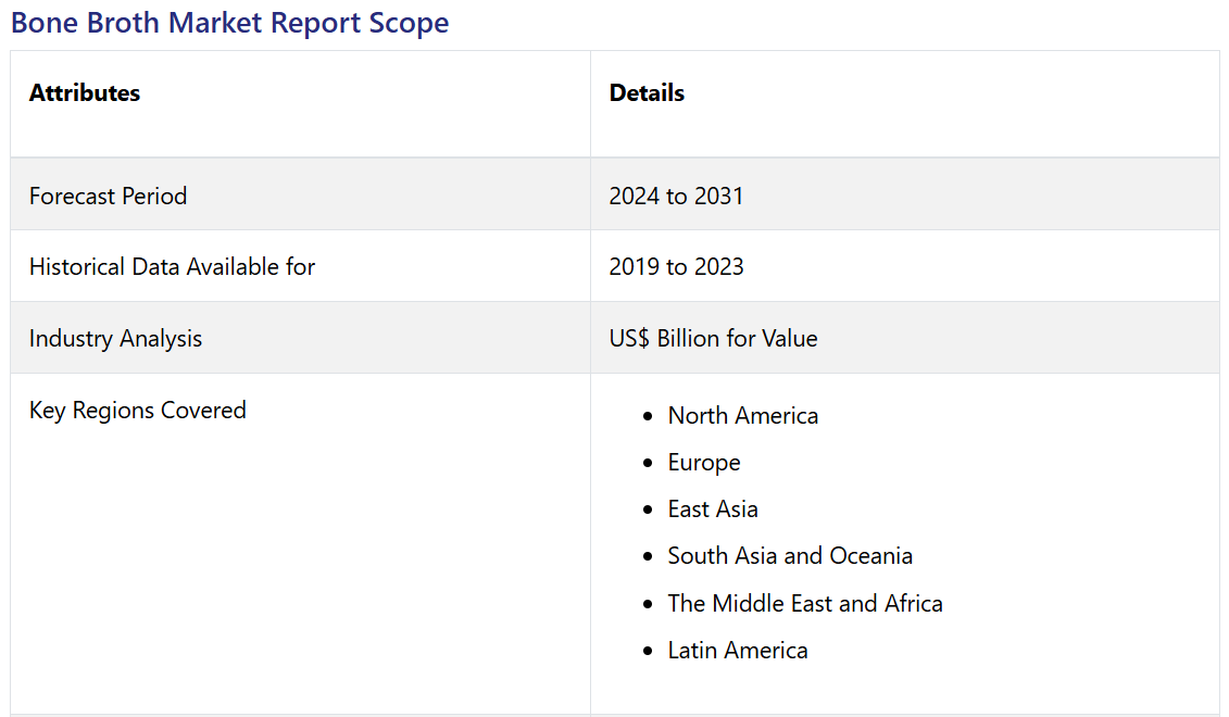ボーンブロス市場は、歴史的な期間に年平均成長率(CAGR)4.3%を記録しました。2019年には、ケト食とパレオ食が主流となりました。そのため、高タンパク質とコラーゲンを含む粉末ボーンブロスが、これらの食事法で好まれる商品として登場しました。