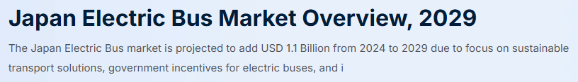 Bonafide Research発行の調査レポート「日本の電気バス市場概要、2029年」によると、日本の電気バス市場は2024年から2029年にかけて11億米ドルを追加すると予測されています。日本には、世界で最も進んだ電気自動車充電インフラがあります。従来のデポ充電ソリューションに加え、日本の都市はワイヤレス充電や超高速充電システムなどの革新的な充電技術を導入しています。このような進歩とともに、環境の持続可能性は日本社会の中核的価値観であり、電気バスの採用は、二酸化炭素排出量の削減と気候変動との闘いに対する日本のコミットメントと一致しています。電気バスに移行することで、日本の都市は大気の質を改善し、騒音公害を減らし、より健康的で住みやすい都市環境を促進することを目指しています。さらに、官民の利害関係者の協力が、日本の電気バス市場の成長を後押ししてきました。交通機関、車両メーカー、エネルギー企業、政府機関は、互いの専門知識と資源を活用しながら、電気バスの開発と配備に協力しています。日本国内の電気バス市場が堅調である一方、日本のメーカーは国際市場でも存在感を高めています。水素燃料電池バスのトヨタや電気ミニバスの三菱自動車のような企業は、革新的な輸送ソリューションを世界各国に輸出しています。電気バス技術における日本の専門知識と、その品質と信頼性に対する評価は、世界の電気バス市場を形成し続けています。全体として、日本の電気バス市場の特徴は、技術革新、環境への配慮、協力的パートナーシップの組み合わせにあります。