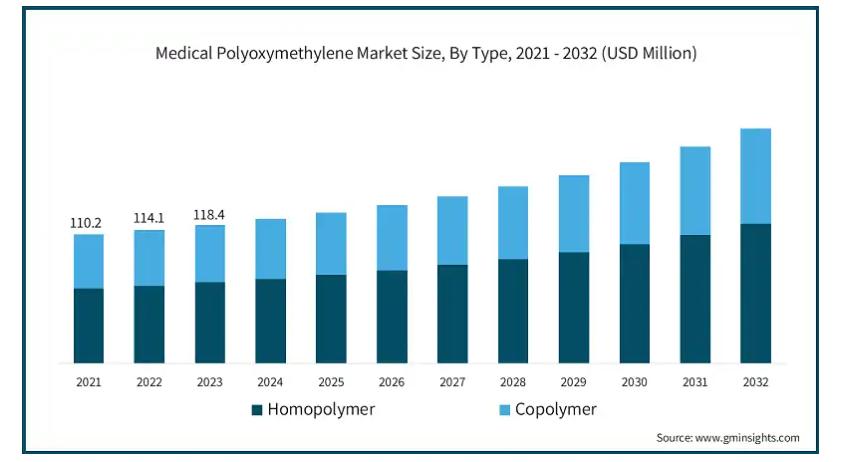 ホモポリマーであるポリオキシメチレンは、コポリマーに比べて高い剛性、強度、結晶化度などの優れた機械的特性により、医療市場で広く使用されています。これらの特性により、手術器具のハンドル、カテーテル部品、寸法安定性と剛性を必要とするその他の医療装置などの精密医療部品に最適です。さらに、耐薬品性、低摩擦性、優れた摩耗特性により、滅菌や使用を繰り返す用途にも適しています。