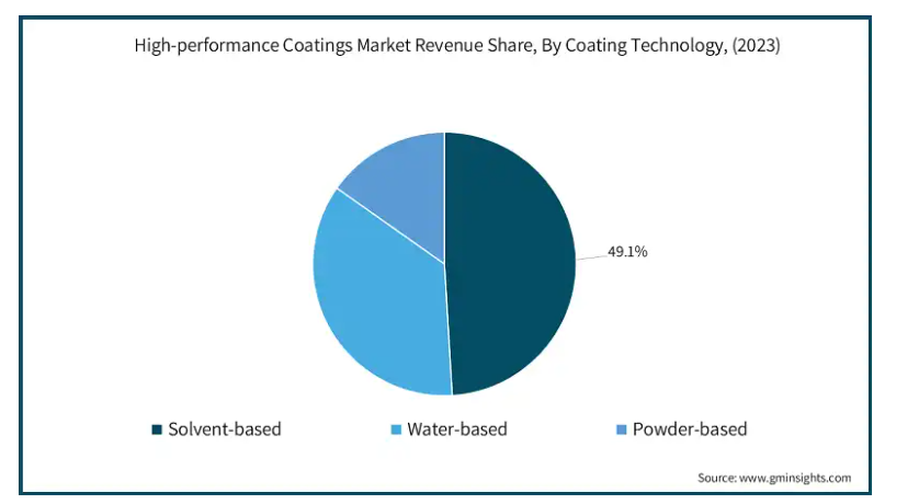 高機能塗料市場は、塗料技術によって粉体塗料、溶剤系塗料、水系塗料に分類されます。溶剤系塗料は2023年に49.1%の市場セグメントを獲得。高性能塗料は、その優れた塗装特性と耐久性、魅力的で滑らかな表面から、溶剤ベースの配合が主流となっています。溶剤系塗料は、ほとんどの基材に優れた接着性を発揮し、複雑な工業用途に不可欠な耐薬品性にも優れています。水性配合の中には、厳しい条件下では効果が劣るものもあります。また、溶剤ベースの製品は乾燥が早いため、性能が向上します。その適用範囲は広く、表面へのスプレーや刷毛塗りが含まれます。