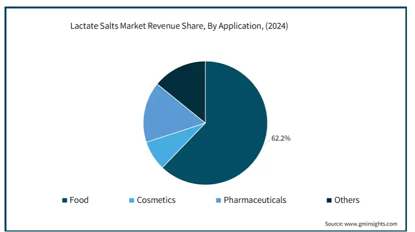 乳酸塩市場は用途に基づき、食品、化粧品、医薬品、その他に区分されます。市場は食品が62.2%と圧倒的なシェアを占めています。乳酸塩は、主に保存料、酸度調整剤、風味調味料として食品産業で重要な役割を果たしています。微生物の増殖を抑制し、食品の品質を維持することで、製品の保存性を向上させます。乳製品、飲料、加工肉、焼き菓子などによく使用される乳酸塩は、人工的な添加物に頼らずに鮮度を維持するのに役立ちます。食感や安定性を向上させながら、ナチュラルでクリーンラベルなソリューションを提供する乳酸塩は、食品分野でますます人気が高まっています。より健康的で加工度の低い食品に対する消費者の需要の高まりが、この市場での使用をさらに後押ししています。