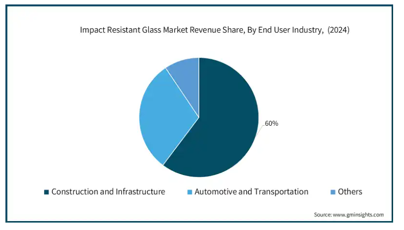 耐衝撃性ガラス市場は、エンドユーザー産業別に、建設・インフラ、自動車・輸送、その他に区分されます。建設・インフラ分野が市場の60%を占めています。建設・インフラ分野は市場の成長に大きく貢献しています。高層ビル、複合商業施設、公共インフラでは、安全基準を満たし、構造的完全性を高めるために、このガラスを採用するケースが増えています。極端な天候、衝撃、侵入の可能性に耐えるガラスは、近代的な建築設計に不可欠です。また、都市化の進展やスマートシティプロジェクトにより、住宅用・商業用ともに耐衝撃ガラスの需要が高まっています。