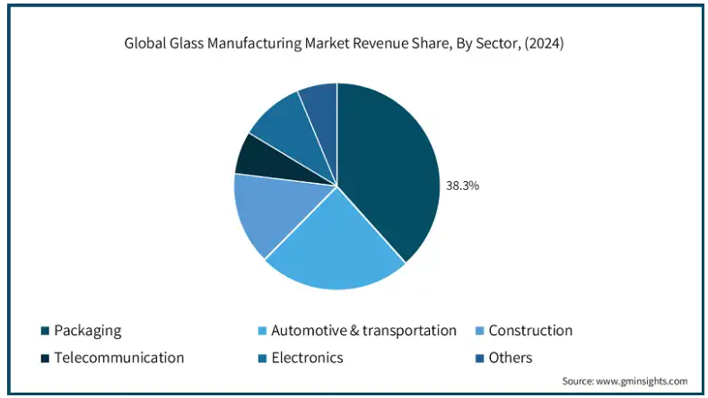 ガラス製造市場を分野別に分類すると、包装、自動車・輸送、建設、通信、電子に分けられます。パッケージは市場の37%を占めると推定されています。