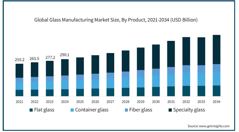 この調査レポートは、ガラス製造市場を詳細に調査し、2021年から2034年にかけての収益予測(億米ドル)を掲載しています: