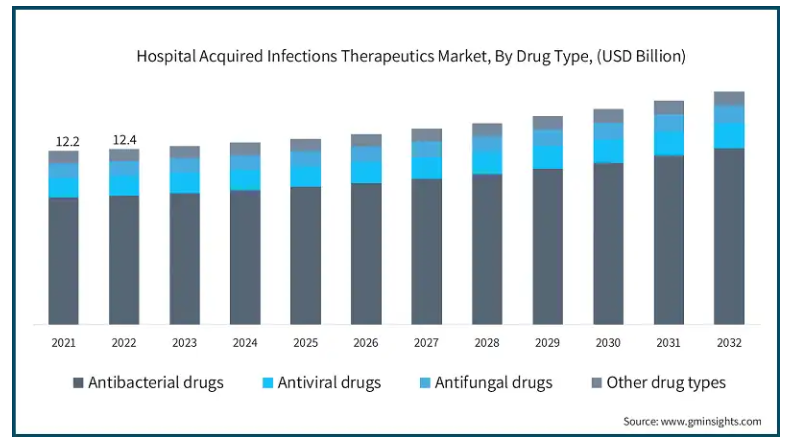 さらに、入院患者数の増加傾向、入院期間の長期化、侵襲的装置の使用の増加が、尿路感染症、肺炎、血流感染症を対象とした治療介入に対する需要の高まりをもたらす主な要因となっています。さらに、免疫不全患者の増加もHAIの成長を促し、それに伴いHAI治療薬市場も拡大しています。さらに、医療関連感染の負担の増大も、HAI治療薬市場全体に好機をもたらすでしょう。例えば、CDCによると、アメリカではある日の病院患者の31人に1人が何らかの形で医療関連感染に苦しんでいます。