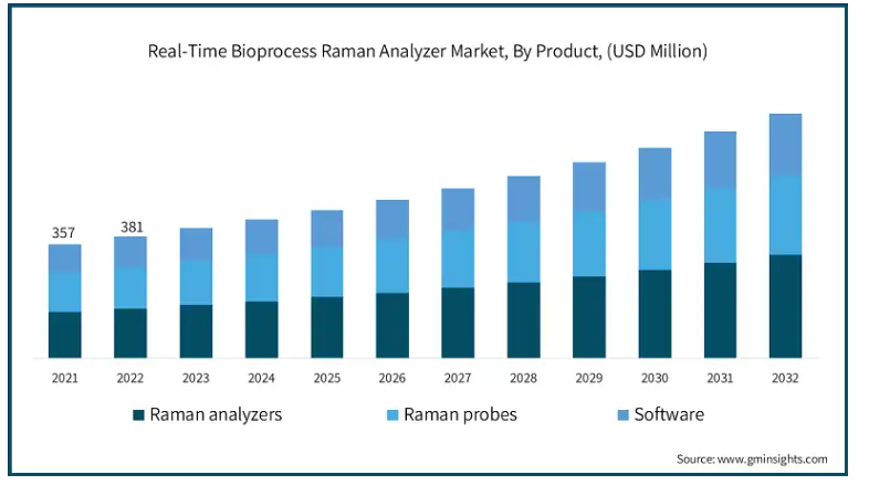 ラマンアナライザは、リアルタイムバイオプロセスモニタリングの中核技術。ラマンアナライザは、分子構造を感知し定量化するために必要な分光学の構成要素をすべて備えており、精度が最も重要なバイオ医薬品工学の用途に最適。これがラマン分析装置が市場を独占している理由であり、プローブやソフトウェアなどの他の製品は補助的なものに過ぎません。