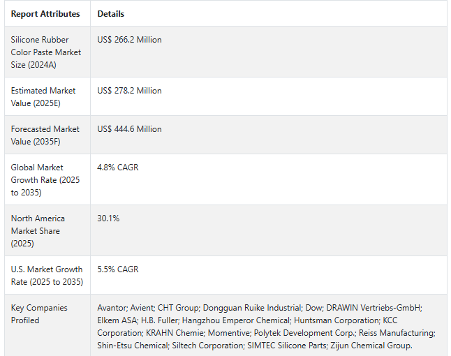 市場調査および競合情報提供会社であるFact.MRによると、前述の事実を背景に、シリコーンゴムカラーペースト市場は2025年から2035年までの予測期間中にCAGR 4.8%で成長すると予測されています。