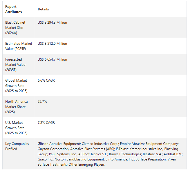 市場調査および競合情報を提供するFact.MRによると、前述の事実を背景に、ブラストキャビネット市場は2025年から2035年までの予測期間中にCAGR 6.6%で成長すると予測されています。