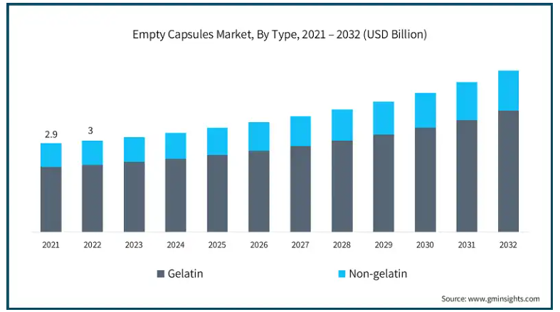 空カプセルの市場規模は2023年に31億米ドルとなり、2024年から2032年までの年平均成長率は6.3%と推定されます。健康意識の高まりと予防医療のトレンドに後押しされた栄養補助食品と栄養補助食品の需要の高まりが、カプセルの消費を大幅に押し上げています。さらに、製薬業界では、飲み込みやすさ、味のマスキング機能、放出制御の可能性から、従来の錠剤よりもカプセル製剤が好まれるようになっています。