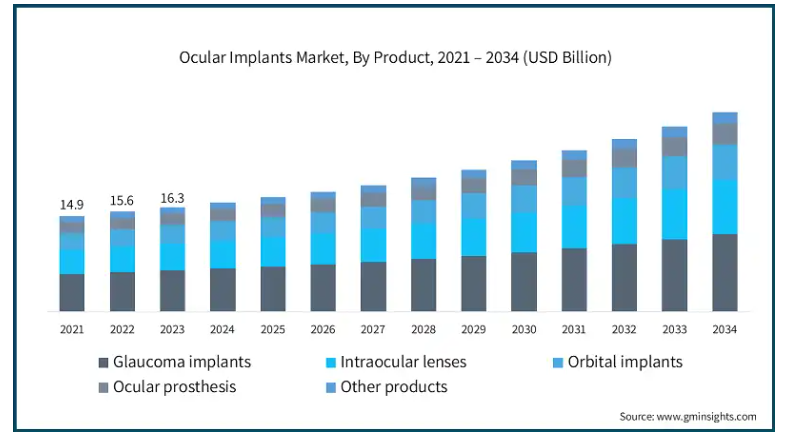 この調査レポートは、眼インプラント市場を詳細に調査し、2021年から2034年までの予測および収益(百万米ドル)を以下の分野別に掲載しています: