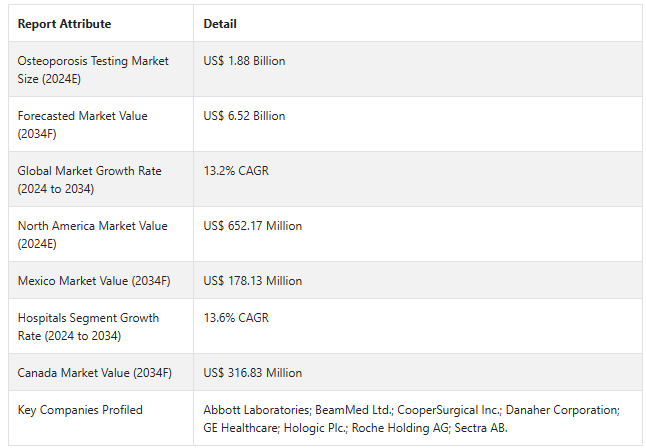 世界の骨粗鬆症検査市場の2024年の市場規模は現在18.8億米ドル。市場は年平均成長率13.2%で拡大し、2034年には65.2億米ドルに達すると予測されています。