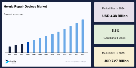 ヘルニア修復装置の世界市場規模は2024年に43億8000万米ドルと評価され、2025年の46億3000万米ドルから 2033年には72億7000万米ドルに成長すると予測され、予測期間中(2025年〜2033年)の年平均成長率は5.8%です。