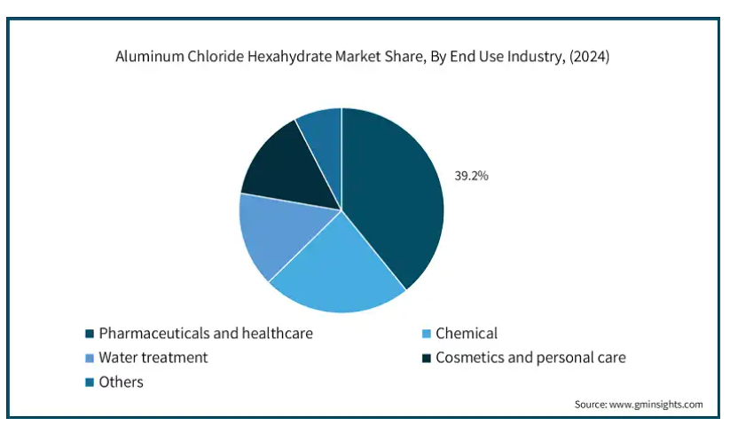 塩化アルミニウム六水和物市場のエンドユーザー分類には、医薬品・ヘルスケア、化学、水処理、化粧品・パーソナルケア、その他の産業が含まれます。医薬品・ヘルスケア分野は2024年に約39.2%と、より大きなシェアを占めると予想されています。塩化アルミニウム六水和物は、制汗剤などのスキンケア治療、多汗症に対する安全で効果的な解決策の提供、その他の医療用途に広く採用されています。