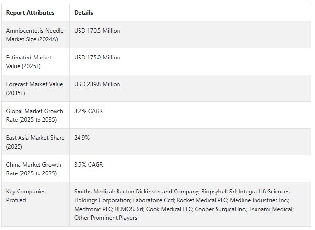 市場調査および競合情報を提供するFact.MRによると、前述の事実を背景に、羊水穿刺針市場は2025年から2035年までの予測期間中にCAGR 3.2%で成長すると予測されています。