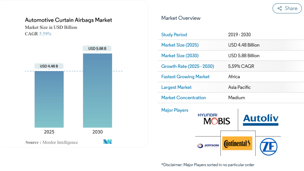 自動車用カーテンエアバッグ市場規模は、2025年に44億8,000万米ドルに達し、2030年までに58億8,000万米ドルに達すると予測されており、年平均成長率(CAGR)は5.59%を記録する見込みです。この勢いは、世界的に厳格化する側面衝突に関する法規、スポーツ用多目的車(SUV)の出荷台数の急増、電気自動車(EV)のスケートボードプラットフォーム[1]によって実現されたパッケージングの自由度といった要素が相まって生み出されています。