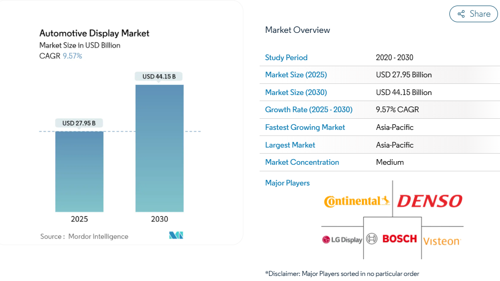 自動車用ディスプレイ市場の規模は、2025年に279億5,000万米ドルと評価されており、2030年には441億5,000万米ドルに達すると予測されています。この期間中、年平均成長率(CAGR)9.57%で拡大する見込みです。ソフトウェア定義車両アーキテクチャの拡大、没入型インフォテインメントへの需要増、運転自動化の進展により、ディスプレイは単純な情報表示装置から、人間と機械のインターフェース(HMI)の中核資産へと進化しています。