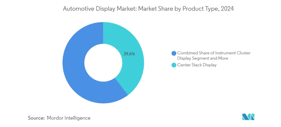 センタースタックコンソールは2024年に売上高の39.61%を占め、車両の司令塔としての役割を強調しています。このセグメントは、自動車ディスプレイ市場のソフトウェア収益化への移行に沿った、拡張可能な画面サイズ、タッチファースト操作、アプリストア互換性の恩恵を受けています。HUDの搭載率は年平均成長率10.14%で最も急速に増加しており、安全規制と視線を外さずに確認できるナビゲーション情報の消費者需要に支えられています。両製品ラインの組み合わせは、自動車ディスプレイ市場が階層化されたUX戦略(深い操作のための包括的なコントロールパネルと、重要な運転者警報のためのフロントガラス投影)をいかに支えているかを体現しています。
