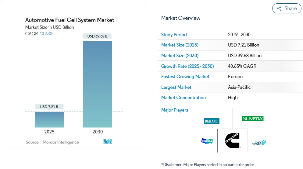 業界では、特に技術獲得と市場拡大を目的とした合併・買収活動が活発化しています。企業は補完的な強みを結集する戦略的提携を構築しており、自動車メーカーは燃料電池専門企業と提携し、技術開発と商業化を加速させています。地域プレイヤー、特に中国や韓国などのアジア太平洋市場では、政府支援と積極的な拡大戦略により重要な競合相手として台頭しています。市場では垂直統合の傾向が見られ、燃料電池スタックの開発からシステム統合まで、バリューチェーンの様々な側面を制御しようとする動きが広がっています。