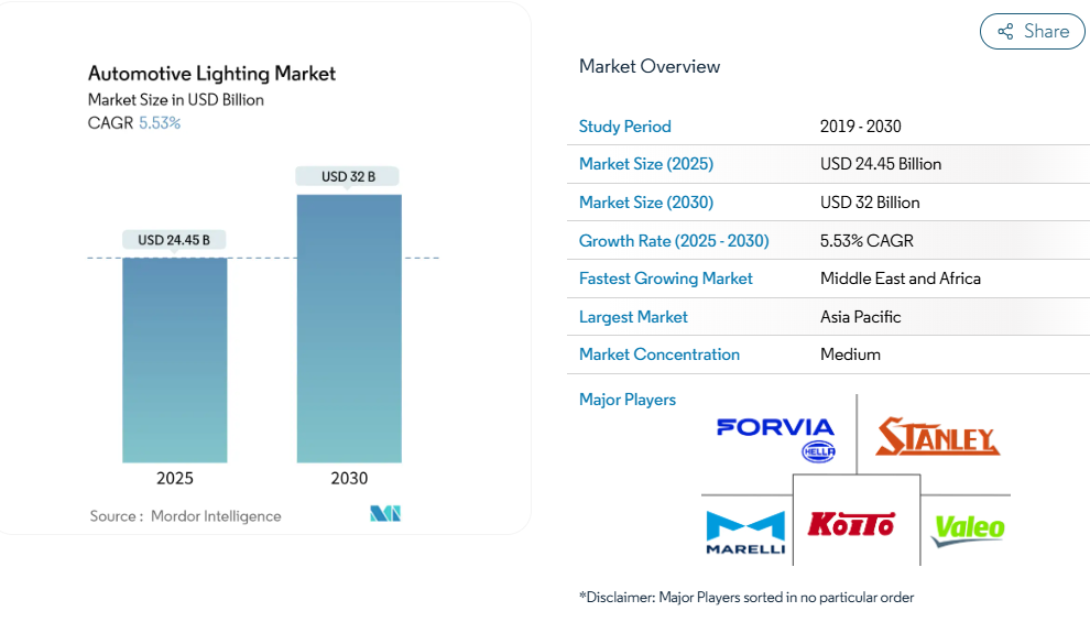 上位5社のサプライヤーが世界収益の大半を占めており、適度に集中した市場ながら地域新興企業の参入余地が残されています。小糸製作所の優位性は、日米OEMプラットフォームとの深い連携と適応型ビーム研究開発への早期参入を反映しています。ヴァレオは高解像度投影のためのピクセルマトリクス技術を活用し、フォルビア・ヘラはソフトウェア定義照明の受注を米国自動車メーカーとの数十億ドル規模契約に転換、国内調達重要性を示しています。