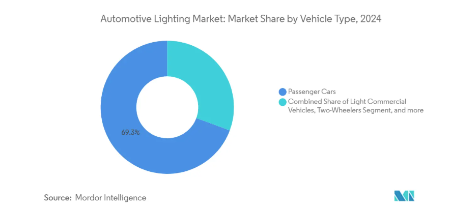 乗用車セグメントは2024年の売上高で69.36%のシェアを占め、自動車照明市場を主導しました。一方、二輪車は7.45%という最速のCAGR(年平均成長率)を記録すると予測されています。電動スクーターがバッテリー持続時間を確保するため低消費電力LEDを優先する傾向から、二輪車向け自動車照明市場規模は拡大する見込みです。Fiem Industries社は、3年以内に生産ライン導入予定のバイク向けLEDプロジェクトが80件以上あることを明らかにしました。小型商用車フリートは、密集した都市部でのラストマイル安全性を高めるため、適応型ヘッドランプに依存しています。中型・大型トラックの更新ペースは遅いものの、視認性テープや走行灯の義務化により、着実な改造需要が継続しています。