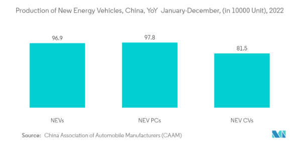 - また、中国汽車製造協会(CAAM)によると、2022年12月の新型電気自動車(NEV)の生産台数は前年比96.9%増。このように、電気自動車市場の拡大は、同国における自動車用プラスチックの需要を増加させると予想されます。