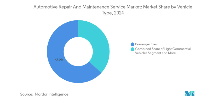 乗用車は2024年に自動車修理・整備サービス市場の63.21%を占め、2030年まで年平均成長率6.19%で拡大が見込まれます。老朽化したセダンやSUV、ADAS後付け装置、ソフトウェア更新が、従来のオイル交換を超えた多層的な収益源を生み出しています。軽商用車はEC拡大の恩恵を受け、配送ピーク時を避けたサービス計画を可能にする予知保全ソフトウェアの導入が進んでいます。大型商用車は貨物輸送に不可欠であり、排出ガス規制による定期的な後処理装置の整備が義務付けられています。二輪車はアジア太平洋地域で都市部シェアを獲得していますが、平均単価が低いため世界的な影響は限定的です。