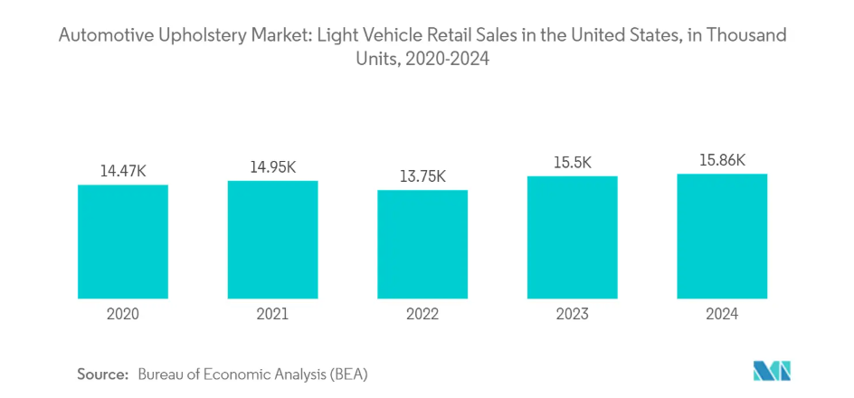 しかしながら、原材料価格の変動や、有害大気汚染物質(HAP)排出抑制を目的とした政府の厳格な規制が、市場成長の課題となっています。しかしながら、自動運転車の台頭やベンチレーションシートなどの座席技術の進歩は、今後数年間で自動車内装メーカーに新たな機会をもたらすと予想されます。