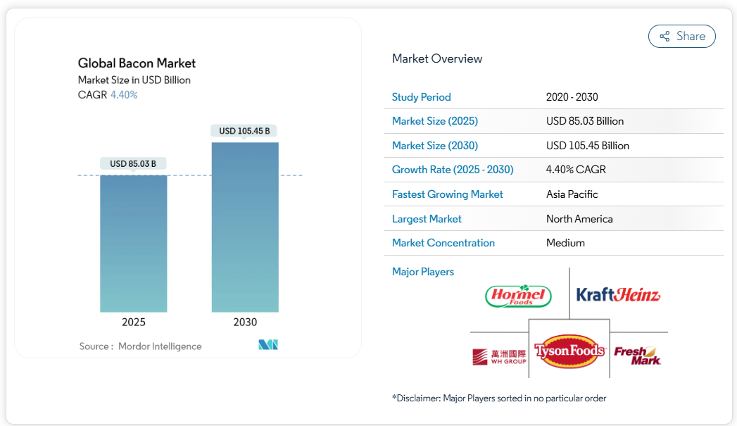 ベーコン市場の規模は、2025年の850億3000万米ドルから2030年までに1054億5000万米ドルへ、年平均成長率(CAGR)4.40%で拡大すると予測されております。この市場成長は、朝食食材としての確固たる地位と、様々な料理における風味増強剤としての利用拡大に支えられております。世界的なクイックサービスレストラン(QSR)の拡大は、特にサンドイッチ、バーガー、その他のメニューアイテムにおけるベーコン消費量に大きく寄与しています。アジア都市部市場における可処分所得の増加は、ベーコン製品を含む西洋食品の普及拡大につながっています。