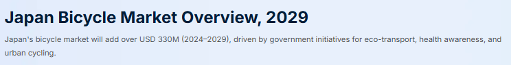 Bonafide Research社の調査レポート「日本の自転車市場の展望、2029年」によると、日本の自転車市場は2024年から29年までに3億1000万米ドル以上になると予測されています。日本におけるサイクリングの人気は、いくつかの要因によって牽引されています。広範な自転車専用道路の整備や自転車共有プログラムなど、サイクリングを推進する政府の取り組みが大きな役割を果たしています。さらに、健康、効率、ミニマリズムを重視する日本文化は、サイクリングに関連する価値観とよく合致しています。日本の都市のコンパクトな都市環境は、日本の効率的な公共交通システムと相まって、多くの人々にとってサイクリングが便利で望ましい選択肢となっています。