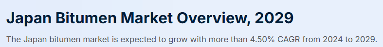Bonafide Research社の調査レポート「日本のアスファルト市場の概要、2029年」によると、日本のアスファルト市場は2024年から2029年にかけて年平均成長率4.50%以上で成長する見込みです。日本のアスファルト市場の成長は、特に道路建設とメンテナンスにおける日本の強力なインフラ開発イニシアチブを含む、いくつかの主要な推進力によって推進されています。日本は交通網の強化に取り組んでおり、既存のインフラの近代化にも注力しているため、アスファルト混合物の主成分としてのアスファルトの需要が大幅に増加しています。さらに、日本は地理的に地震や台風などの自然災害に対して脆弱であるため、継続的なインフラ補強が必要であり、アスファルトベースの製品に対する需要をさらに刺激しています。さらに、日本は持続可能性と環境保護を重視しており、ウォームミックスアスファルトを含む革新的なアスファルト技術の採用につながっています。これらの要因は、都市化や交通インフラへの投資の増加を支持する世界的な傾向と相まって、当面の間、日本のアスファルト市場の成長軌道を維持すると予想されます。