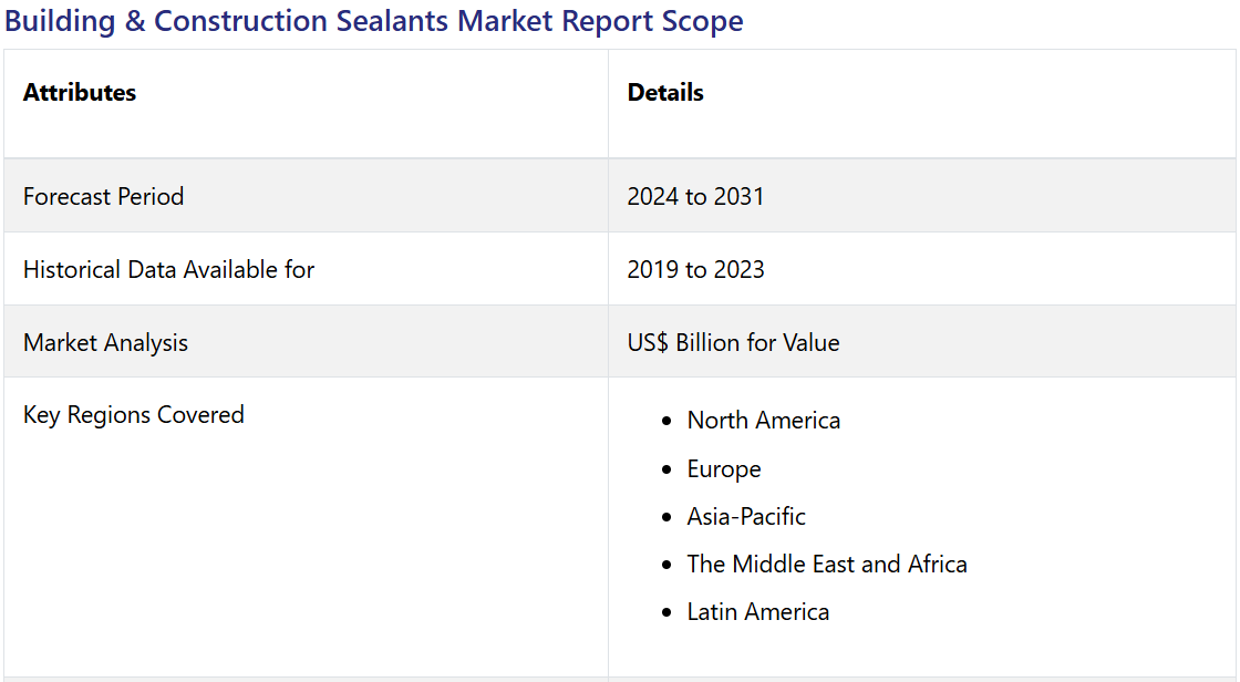 Building & Construction Sealants Market Size, Share and Growth Forecast by Resin (Silicone, Polysulfide, Polyurethane, Emulsion, Plastisol, Butyl-based), Technology (Reactive, Water-based, Solvent-based), Application (Flooring, Construction, Automotive, Packaging, Food & Beverages), and Region for 2024 – 2031