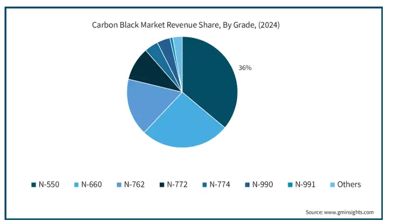 N-550セグメントのカーボンブラック市場は2024年に74億米ドルと評価され、2025年から2034年までのCAGRは6.1%でした。低構造の中活性・中分散カーボンブラックであるN-660は、N-550よりも小さな表面積を誇ります。N-550よりも表面積が小さく、発熱が少なく、加工性に優れ、疲労寿命が長いのが特徴です。一般的に、N-660グレードは乗用車用タイヤのインナーライナーを含むボディコンパウンドに使用されています。洗練されたゴム製品への需要が高まるにつれ、N-660固有の利点と相まって、その需要は急増する見込みです。