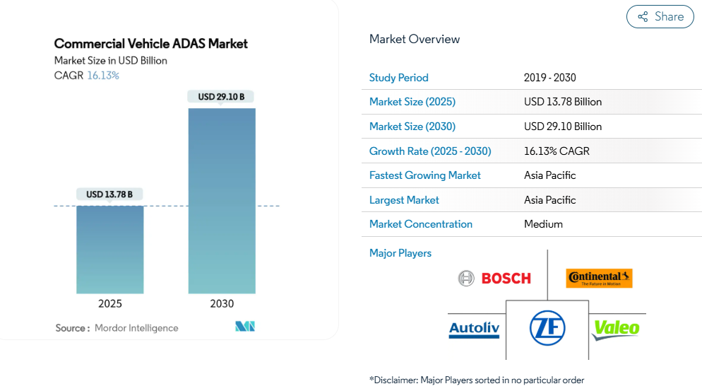 南米と中東では、まだ導入が始まったばかりです。ブラジルの国家交通安全計画は、車線逸脱警報装置を推奨していますが、拘束力のあるスケジュールは定まっていません。湾岸協力会議(GCC)加盟国では、水素トラックの導入を検討するとともに、砂漠のまぶしさに対処するためのカメラミラーシステムの評価も行われています。新興地域では、商用車向け ADAS 業界は、高い輸入関税と限られたキャリブレーションインフラという 2 つの課題に直面していますが、センサーのコスト低下により、2030 年までに徐々に普及が進むと予想されます。