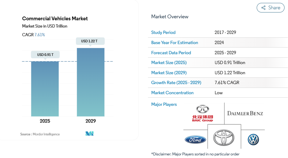 商用車市場の規模は、2025年に0.91兆米ドルと推定されており、2029年までに1.22兆米ドルに達すると予測されています。予測期間(2025-2029年)における年平均成長率(CAGR)は7.61%と見込まれています。