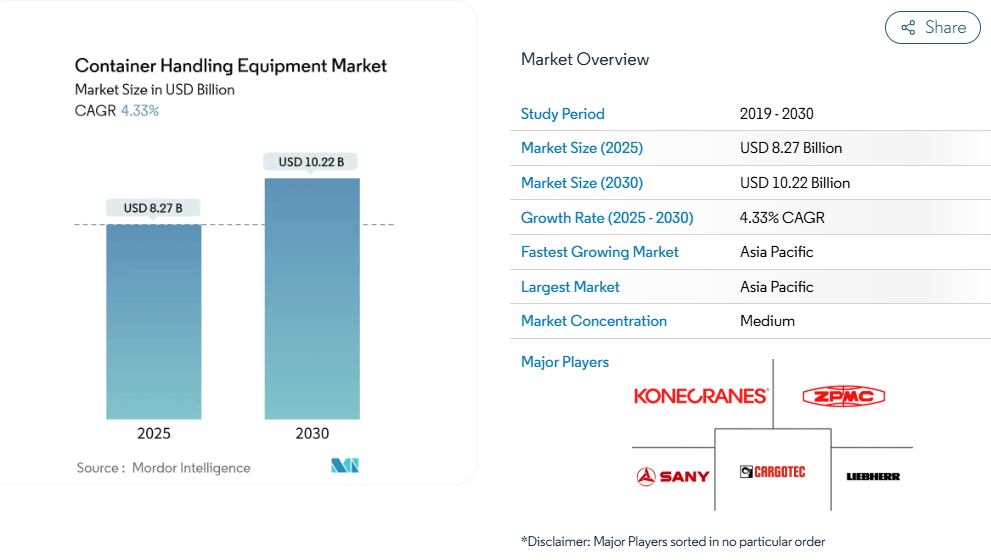 2024年の紅海危機とパナマ運河の干ばつにより、部品の平均リードタイムが30%延長されました。中国製クレーンに対する米国100%関税案はさらなる混乱を招く恐れがあります。ZPMC社は船岸間ユニットの大部分を供給しており、輸入凍結が発生すれば数十の港湾における岸壁作業に支障をきたす可能性があります。半導体不足は継続しており、先進制御システムの納期は12~18ヶ月に延びています。多くのターミナルでは現在、より大規模な予備部品在庫を確保し、可能な限り代替サプライヤーに発注を分散させており、これにより直接的に利益率を圧迫する緊急対応コストが固定化されています。